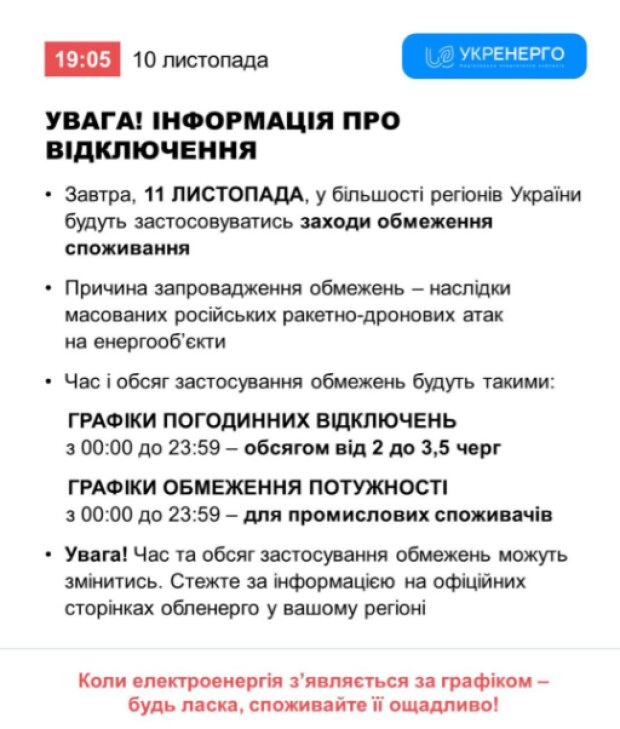 Жителям большинства регионов Украины следует готовиться к отключениям света, 11 ноября, в связи с продолжающимся ущербом энергетической инфраструктуре страны от российских атак, как сообщает Укрэнерго.